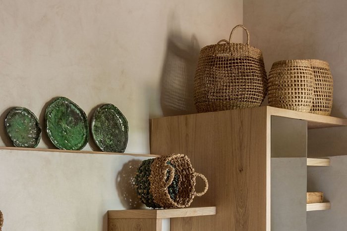 The rooms feature handcrafted furniture, open-space wardrobes and carved stone sinks.
