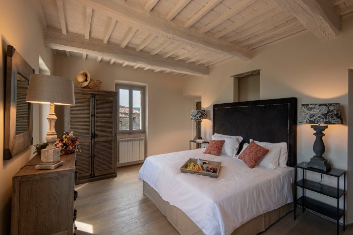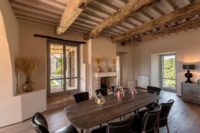 Castell Ugo is situated in an unparalleled position on the top of a hill overlooking the Tiber valley, with breath taking views over fields, rolling hills, olive groves and vineyards. This historic castle and adjoining church dating back to the 11th century, has been meticulously renovated and converted into a luxury villa with stunning infinity pool and it is a perfect location for family holidays, as well as unforgettable events and weddings in the unique historic chapel.The main villa has 6 king size bedrooms with private, marble bathrooms for up to 12 guests and 4 additional bedrooms in the dependance for a total of up to 20 guests