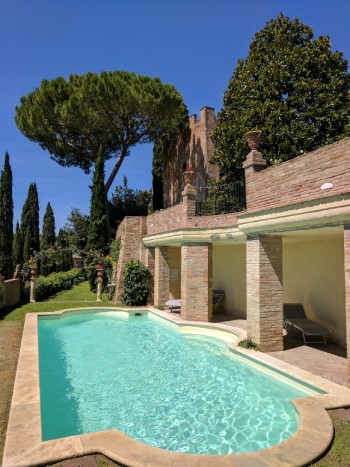 The villa is planted with mature magnolia trees and shrubs and has ample space for relaxing outdoors. The pool is located on a terrace with sun deck below the main garden. There is a shower and fridge at the pool. There are beautiful, wide reaching views over the countryside, vineyards and olive groves. You can see San Gimignano on the horizon to the south.