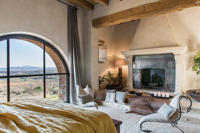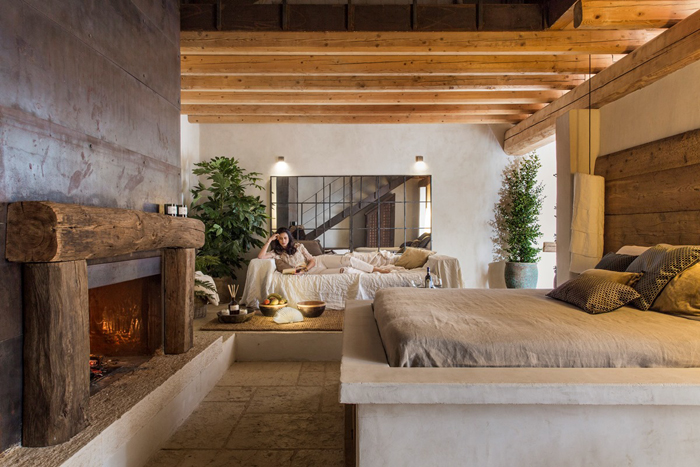 An enormous, 90 sq mt, luxurious bedroom with a king size bed, fireplace, bathroom and roof deck.