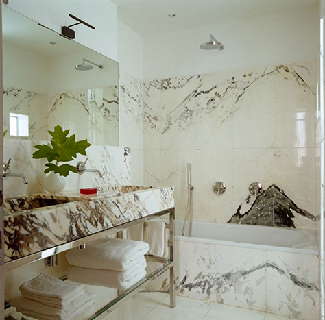 King size bed, all marble bathroom, walk in shower with Turkish bath, stair to bathtub in loft, large counter, back down the stairs, door to terrace.