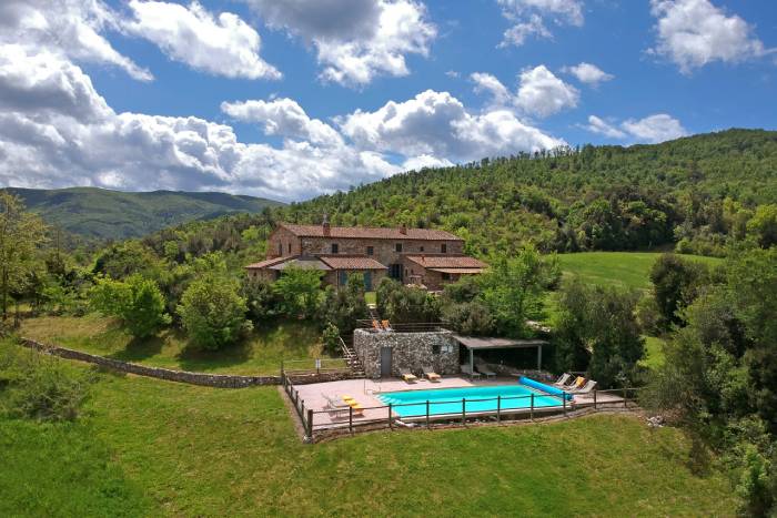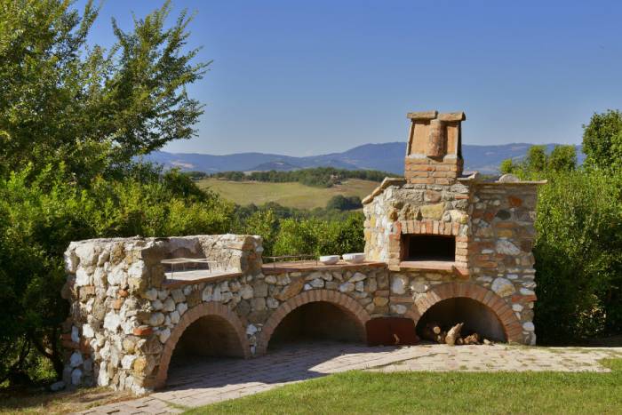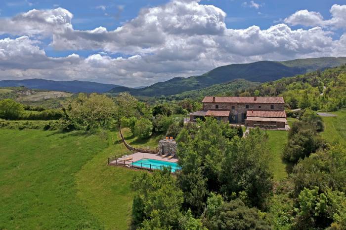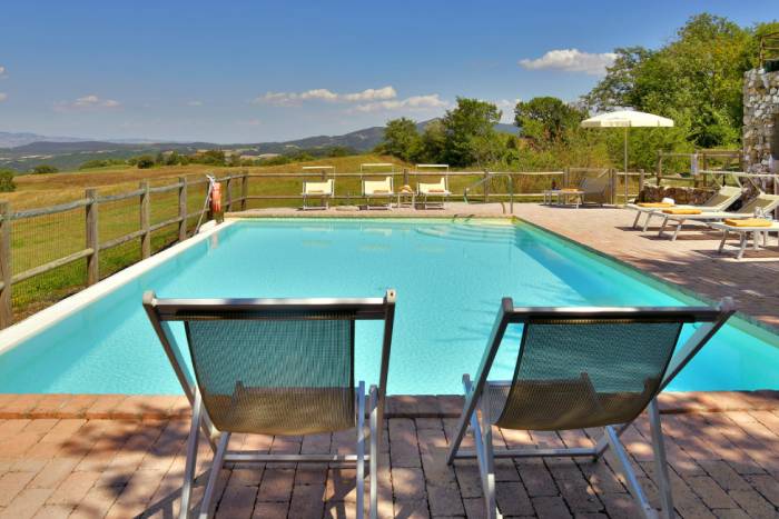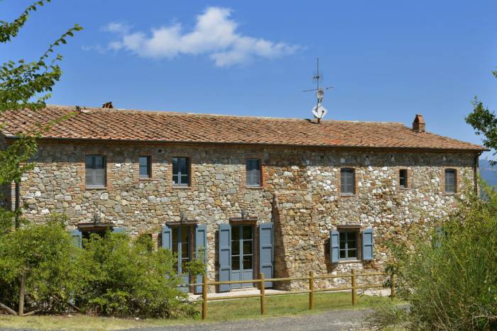 Villa Castagneto is a pretty, stone farmhouse in the hills near Bibbona, a pretty area in the province of Pisa close to the sea. The farmhouse has been restored in traditional Tuscan style, including tiled floors and wooden beamed ceilings. The villa can sleep 18+2 guests. The villa with its heated pool (5x10m) with loungers, deckchairs and umbrellas has beautiful panoramic views of the surrounding Tuscan countryside. There is a panoramic terrace with table and chairs and a bbq with pizza oven. There is a ping pong table. Local shops are at 4km and the closest beach is at 17km.