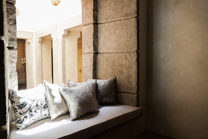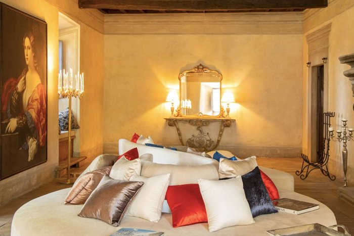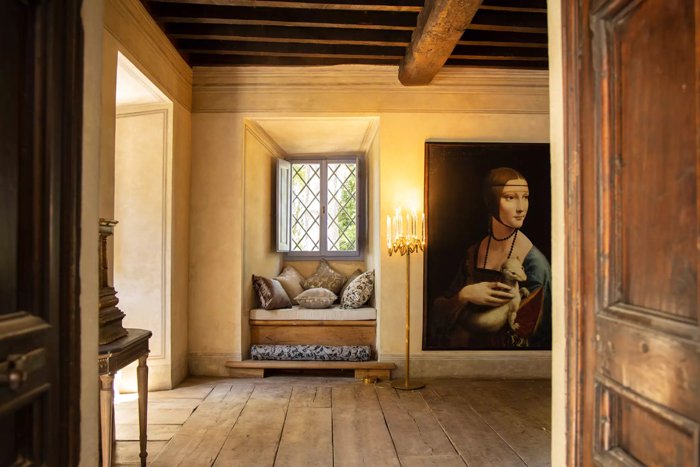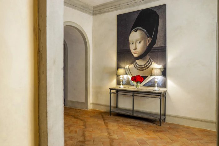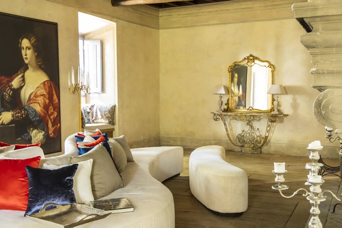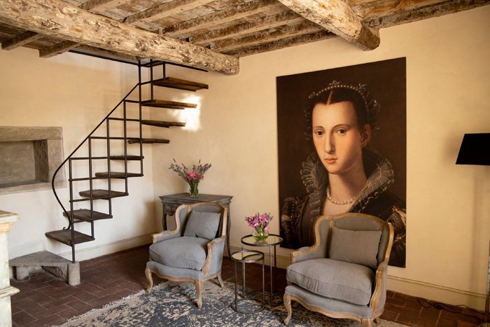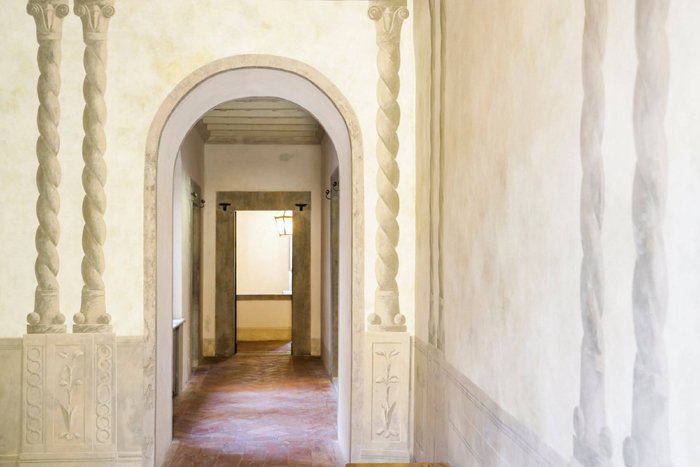 The tower is the oldest part of the villa and is thought to have been built as a watchtower in the 13th century The ground floor of the tower has been meticulously transformed into a charming hall and the original window opens up into the atrium. There is a delightful window seat with plush cushions and a secluded space to relax and enjoy the views. On the first floor there is an impressive hallway, where the walls are hand painted in the trompe-l'œil style. The tower is the tallest part of the villa and its second and third floors now house the tower suite. Parts of the original stone structure are still visible in the tower suite and in the grand suite, providing authentic evidence of a bygone era.