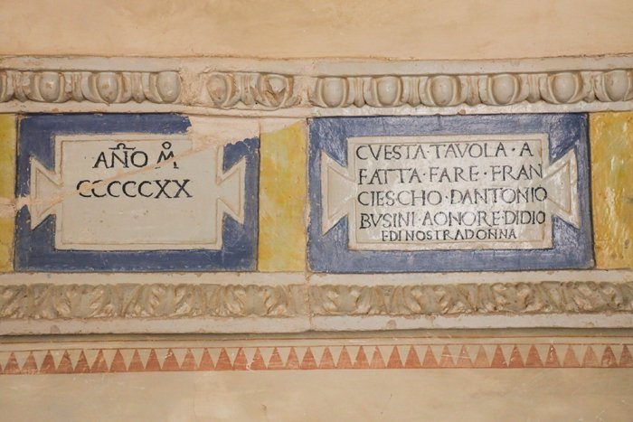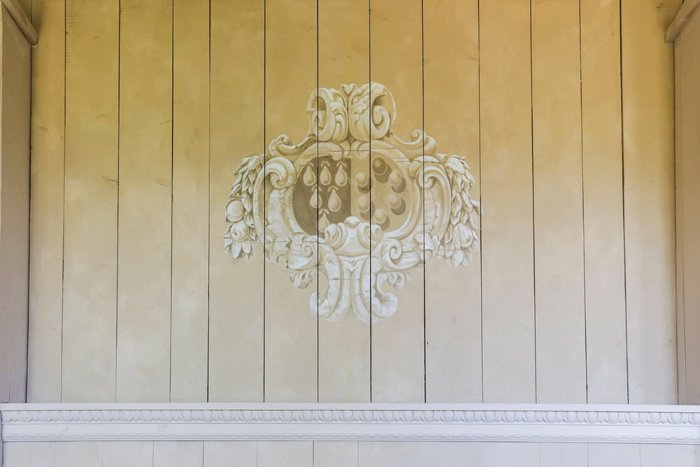 The loggia was built around the atrium, which was once home to a courtyard. Its delightful dark-coffered ceilings, decorated with golden rosettes and elegant blue and pastel wall frescoes contrast and complement the stone door frames and dark wooden doors. The beautiful panel in The Loggia was a gift to the owner from the della Robbia atelier, whose works of art are found in world-class art museums today, including the Uffizi Gallery and the Louvre.