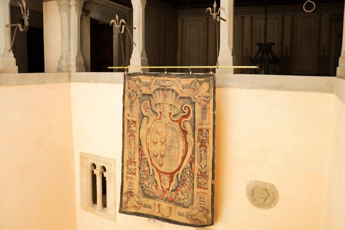 The colourful stained glass windows allow morning light to flood the room and the large natural stone fireplace, with the prominent coat of arms, provides warmth in the evenings. The walls are elaborately decorated by frescoes painted in the trompe-l'œil technique. A large wooden table comfortably seats fourteen guests