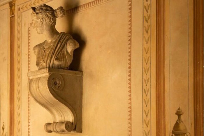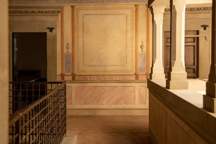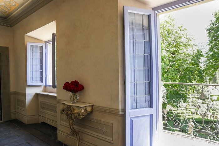 Located close to the villa and originally where lemon bushes were stored in winter. The Limonaia has spectacular views due to its large windows, which overlook the renaissance gardens and the hills beyond. The Limonaia is divided into a number of long, interconnecting sections. The two main sections are the longest with the first boasting an original stone wall and grand doors leading to the second room. This section of the Limonaia opens up to a beautiful terrace with breath taking Tuscan views. The second has been completely hand-painted and decorated in soft, delicate tones and features the Medici Coat of Arms as well as classical Greco Roman columns. Flooded with natural light throughout the day, The Limonaia is a retreat within the villa and exudes both a sense of grandness and serenity. It offers an idyllic place to relax and enjoy the serenity of the Tuscan countryside and is also spacious enough to host private events for up to 40 people.