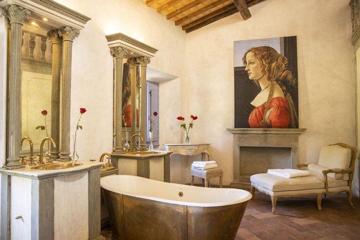 This junior suite is situated on the east corner of the villa, and features a beautifully appointed terrace, which overlooks a small vineyard. The east-facing terrace catches the morning sun, making it an idyllic place to enjoy morning coffee. Sandro Botticelli’s Idealized portrait of a lady, watches over the suite and the elegant renaissance decor combines with modern comforts to provide an unforgettable, luxurious experience. In the bathroom, brass booths enclose the facilities and shower and a charming free-standing bath with ornate brass feet graces the light, spacious room.