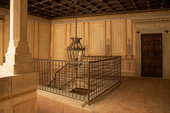 The sacristy is situated next to the chapel. Originally where the priest kept articles of worship, today it is a delightful space and features double doors decorated with the family and Medici coats of arms. The doors open out onto a terrace at the rear of the villa, which has beautiful views over the Tuscan landscape. The room is set up as a TV room with two large crushed velvet couches creating a welcoming ambience, and ideal place to relax and enjoy a classic movie.