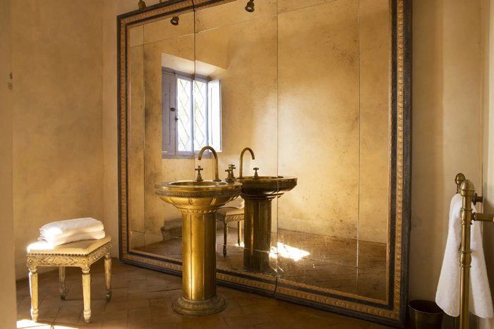 This junior suite is located on the first floor of the villa overlooking the western terrace. The suite offers sweeping views of the countryside and rolling hills and exudes an ambience of serenity. During the renovation, fragments of murals dating back to the 18th century were discovered and have been meticulously preserved. Glimpses of a past era are also captured in the magnificent, renaissance decor. In the delightful bathroom, a giant mirror cleverly conceals the shower and facilities and provides a beautiful reflection of the urn-like earthenware basin and the elegant bath.