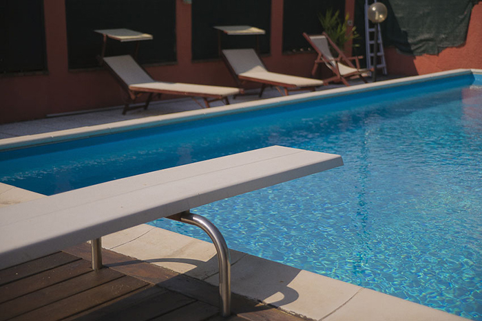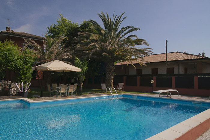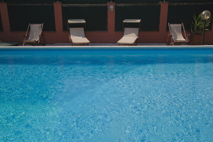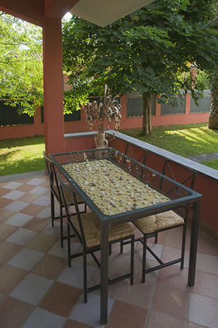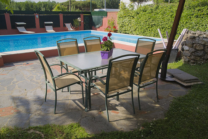 Outdoors there is a terrace with dining table and chairs, which can seat up to 8 people. There is also another dining table for 4, plus another dining area for 6 people under a gazebo, close to the pool (6 x 10 metres). The garden is planted with Mediterranean trees, shrubs and herbs and has a lawn area, which is automatically irrigated. There are swings for children in the group.
