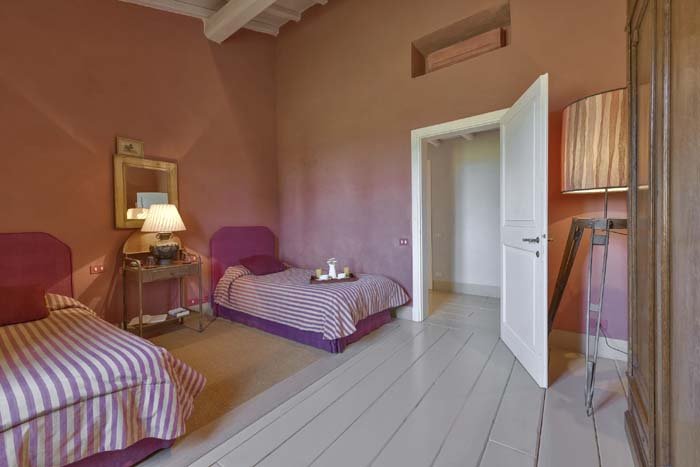 Bedroom 6. Pretty twin bedroom with compact en suite marble bathroom with double sink and a shower (no window in bathroom)