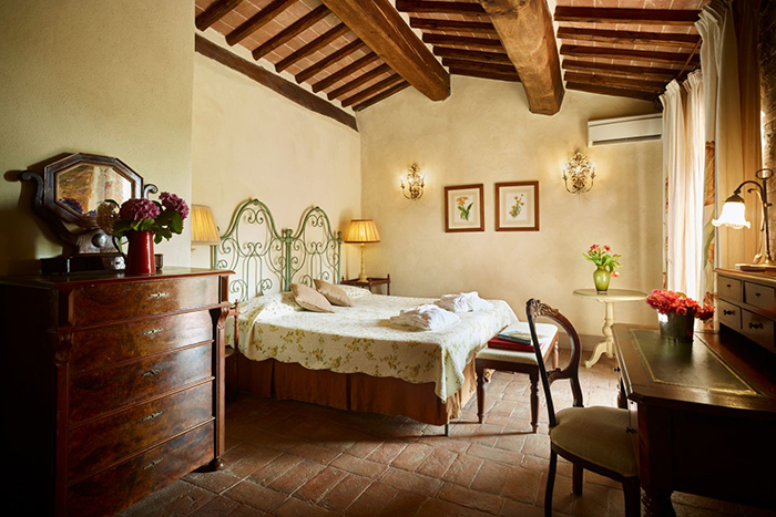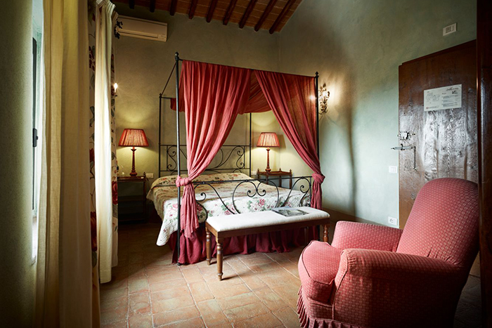 Large Superior room - 30 sq mt – Wrought iron, double, four poster bed, gorgeous view over Val d’Elsa, Queen sofa bed. Small hallway with fitted wardrobe.