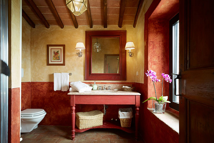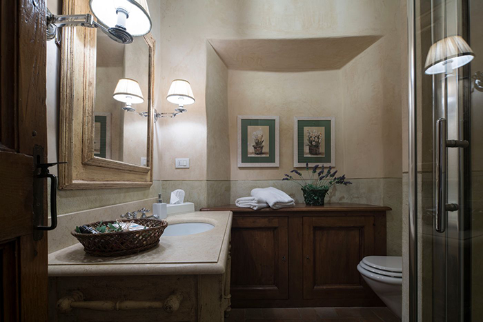 En suite bathroom with double sinks, roll top bath tub with shower. Small terrace equipped with table and chairs, overlooking the surrounding wonderful landscape.