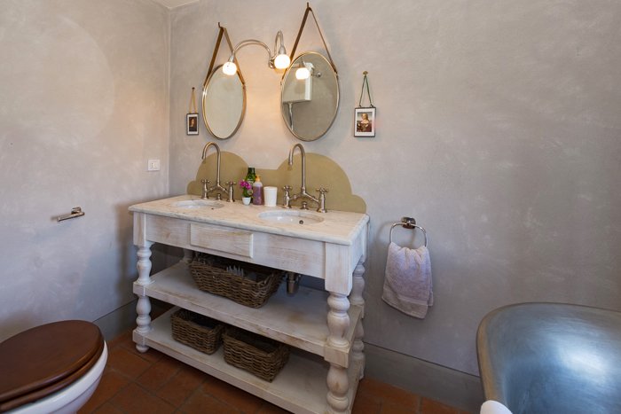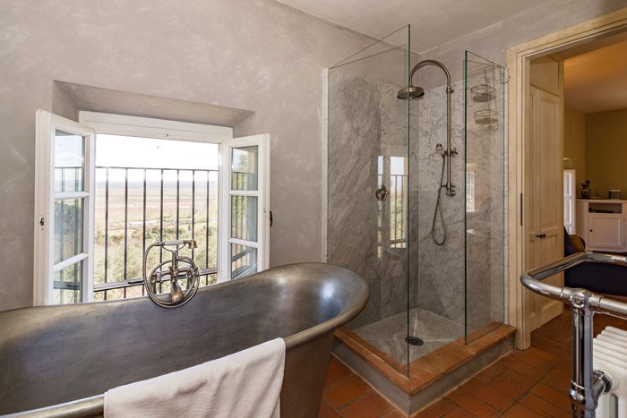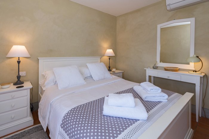 On the top/third floor of the central part of the house, this beautiful, spacious air conditioned room has full length windows taking advantage of olive grove views. Two comfortable single beds with luxury linens, double wardrobe, chest of drawers, bedside tables and lamps. The bathroom has a bath with hand held shower, Carrara marble sink on chestnut wood vanity unit, WC and window with views over woodland.