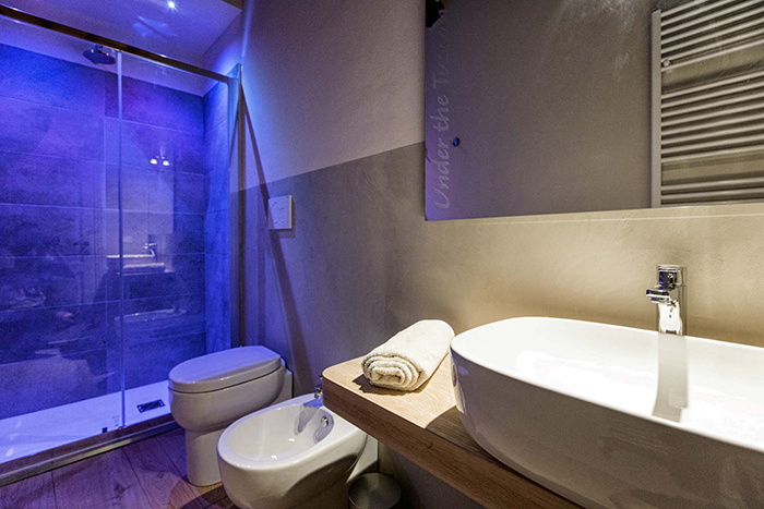 On this floor there are two stylishly, decorated bedrooms, each with an en suite bathroom and one bathroom has a Chromotherapy shower. Both bedrooms have beautiful ceilings and feature wooden beams. Each bedroom has air conditioning-