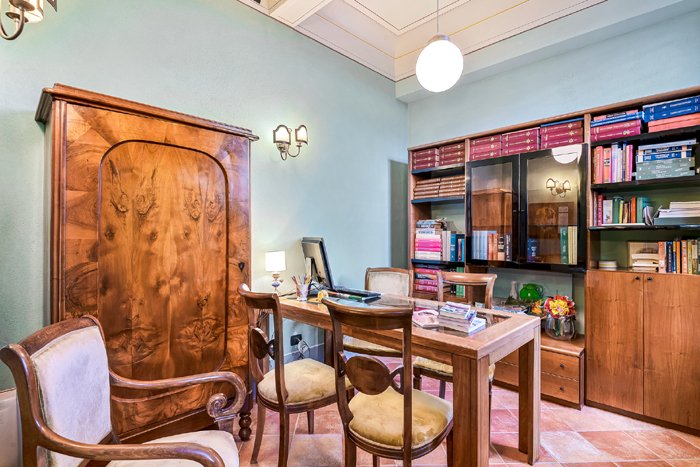 On the ground floor there is a beautiful, spacious, bright reception room with chairs, sofas and coffee tables in a charming Italian style. It is furnished with satellite TV and games, and there is a full equipped study (PC, printer, copier) and WI FI internet access. Adjoining the reception room is a large dining room with frescoed ceilings, with a table large enough to accommodate all guests. Also on the ground floor is a magnificent modern kitchen – large and equipped to a standard which would satisfy the most exacting chef, whether he/she wanted to prepare a grand dinner, or demonstrate the art of Italian cuisine to guests. Next to the kitchen is a laundry room, fully equipped with washing machine, dryer, iron etc. and a larder and a bathroom. To complete the ground floor there are 2 guest bathrooms with disabled accessible toilet and a lift for taking luggage up and down to the bedrooms.