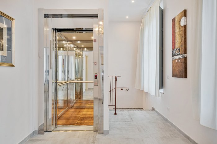 Take the lift or the staircase up to the first floor. The staircase leads you to a hallway. On your right is the lift and then a hallway that runs along the north side of the villa. Just in front of the lift there is a double bedroom with en suite bathroom with shower (wheelchair friendly). Off this hallway there are four bedrooms suites, each with a fully equipped bathroom with tub and an ample luggage and wardrobe space with safe. Then there is a living room area with a sofa bed and mini bar. A staircase leads to a mezzanine bedroom, which has two twin beds, which can be joined to make a king sized double, an armoire, a writing table and a second mini bar. The mezzanine also has a second fully equipped bathroom with shower. The hallway running along the north side of the villa continues up a short flight of stairs, which leads to the last bedroom suite, which has two bathrooms with showers. Each suite is elegantly furnished and decorated with hand-painted ceilings. All guest accommodation is fitted with individual heating/air conditioning so that all rooms are comfortable whatever the season.