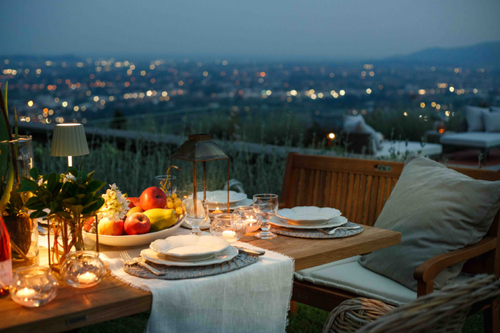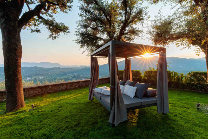 elevation of the garden provides the villa with fabulous panoramic views, which can be enjoyed at sunset