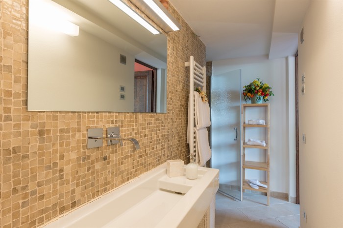 The villa is surrounded by terraces. The lower level has a parking area, whilst the upper levels have woods and an olive grove. The fenced, house garden is full of flowers and surrounded by hedges. There is also a kids’ play area with a swing, playhouse etc. The heated, pool (8x4m) is on a long, panoramic terrace with a relaxation area with loungers and chairs. There is also a gazebo for outdoor dining, which includes a kitchen with a hob/stove, sink, and gas grill.
