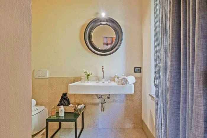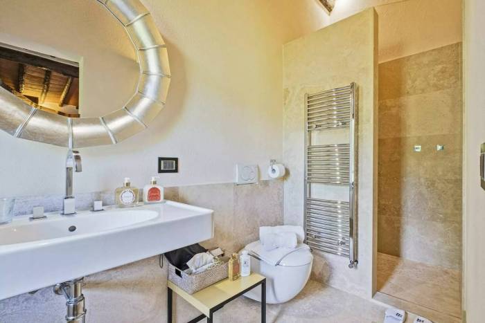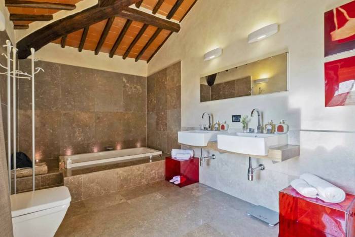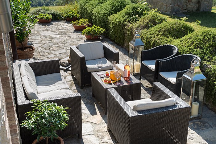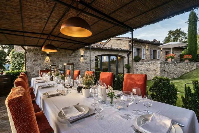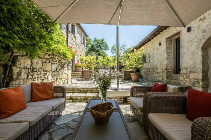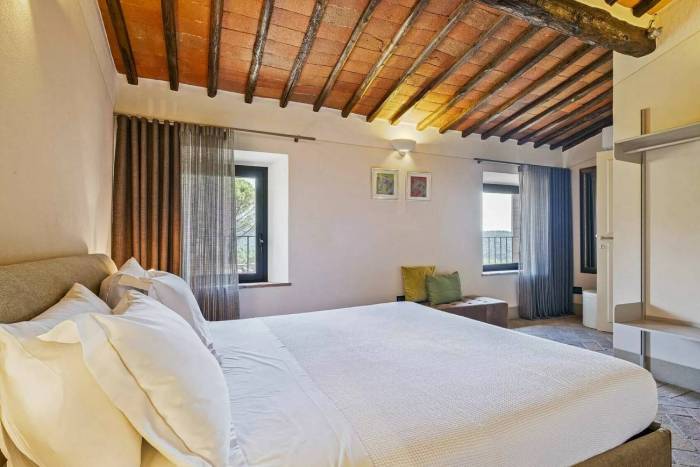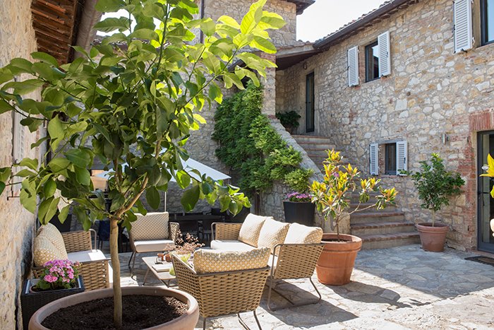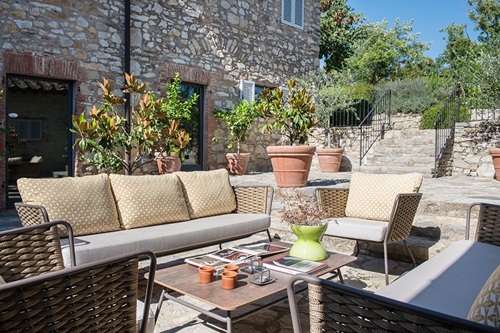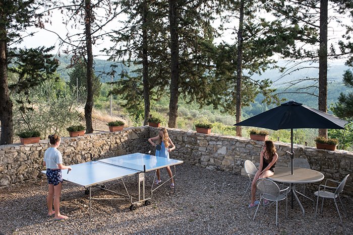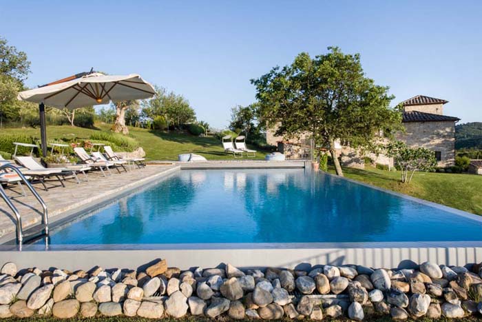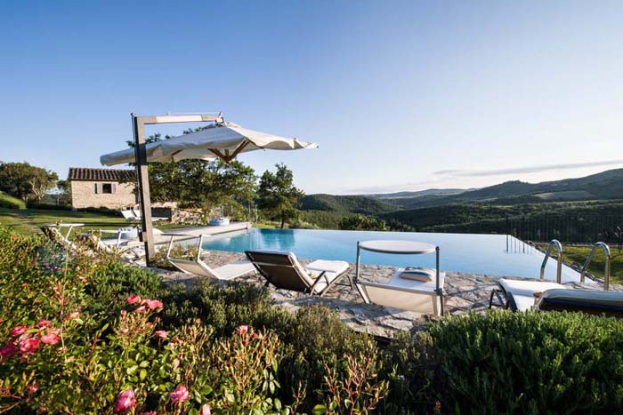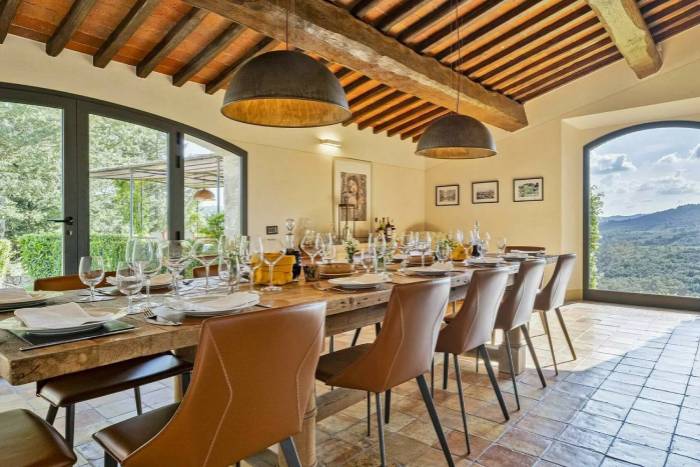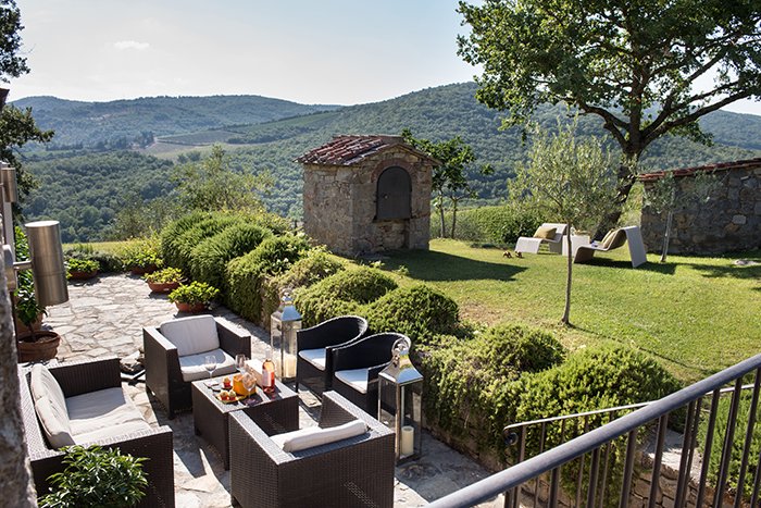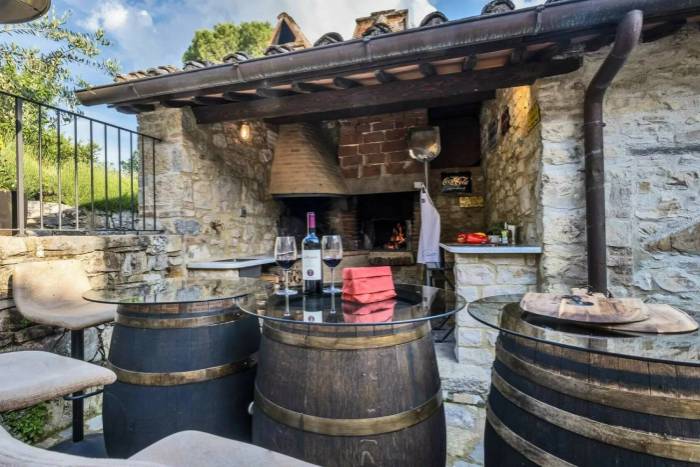Villa Oasi is located in Chianti, between Siena and Florence. The villa has a private hilltop position, with panoramic views of the surrounding Tuscan countryside. It is set in 2 hectares of secluded gardens filled with vines, olives and cypress trees The heated, infinity pool is equipped with sun loungers and deck chairs and is surrounded by wide open lawns. The villa itself is set around a large central courtyard with barbeque area and original stone pizza oven and there are another three terraces with tables and chairs for al fresco living. One in particular is worth mentioning, leading from the large sitting room is a bar zone terrace with sofa, armchairs and candles which overlooks the cascading water of the infinity edged swimming pool.