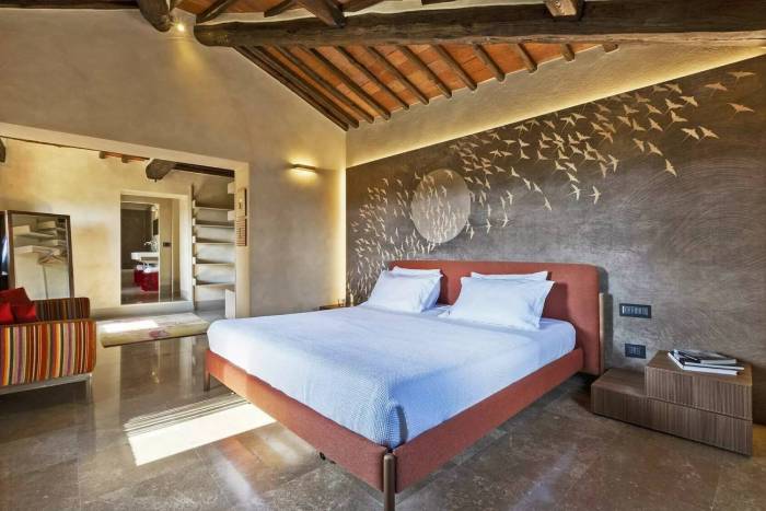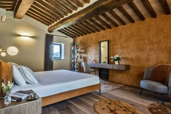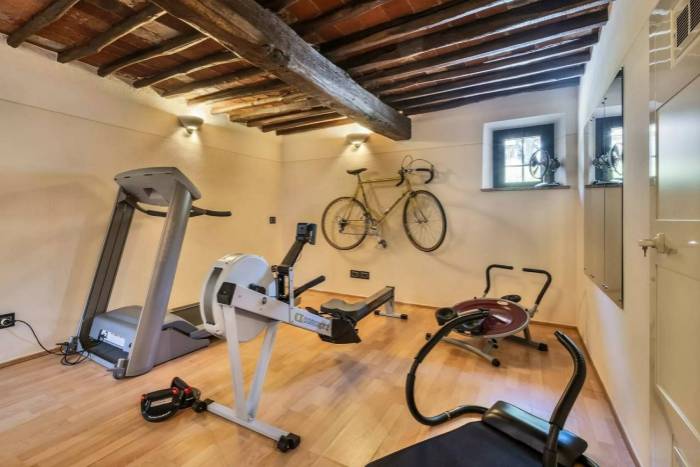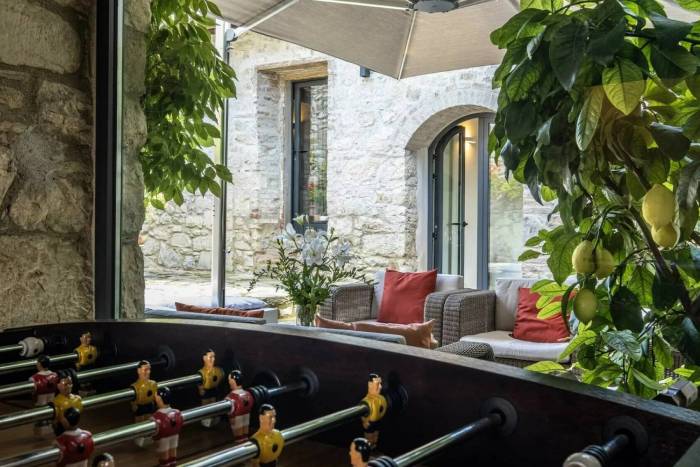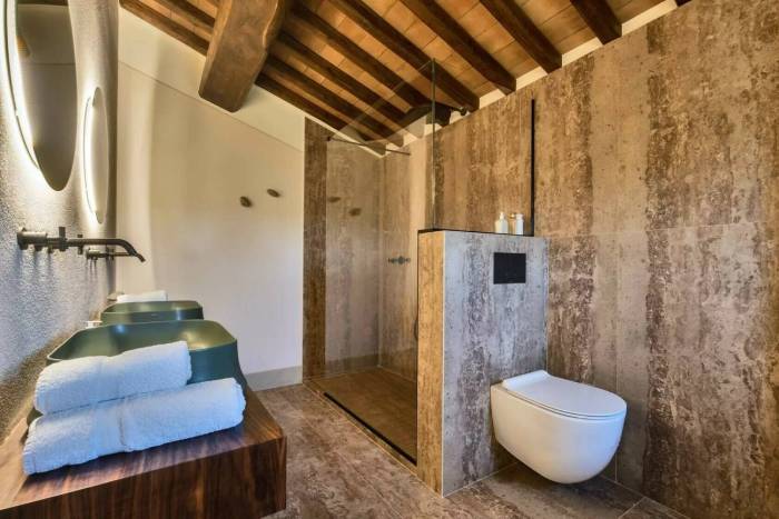 The villa covers a 600 square metres area and has 7 bedrooms, all with en-suite travertine bathrooms and air conditioning, 2 sitting rooms, kitchen, dining room, games room, gym, laundry room and a stunning open plan galleried hallway, Villa Oasi retains a multitude of original features including exposed walls and beams, handmade floor tiles, 18th century antique furniture and an original dove tower. These features are complemented by stylish contemporary furniture and modern art.