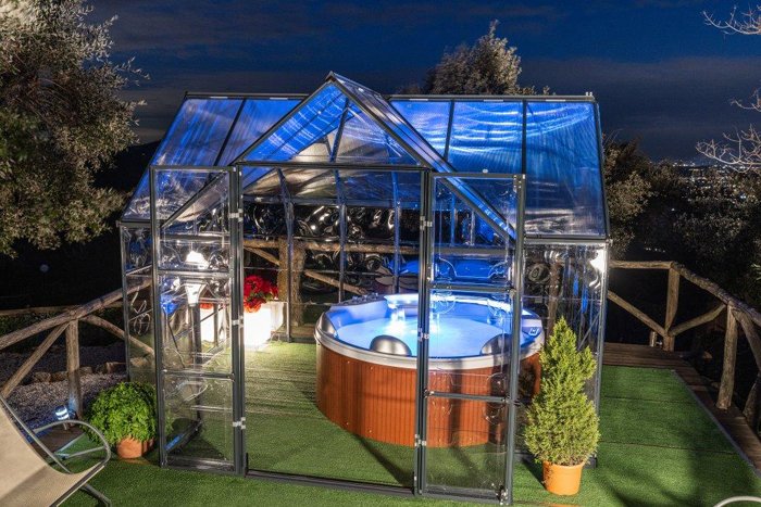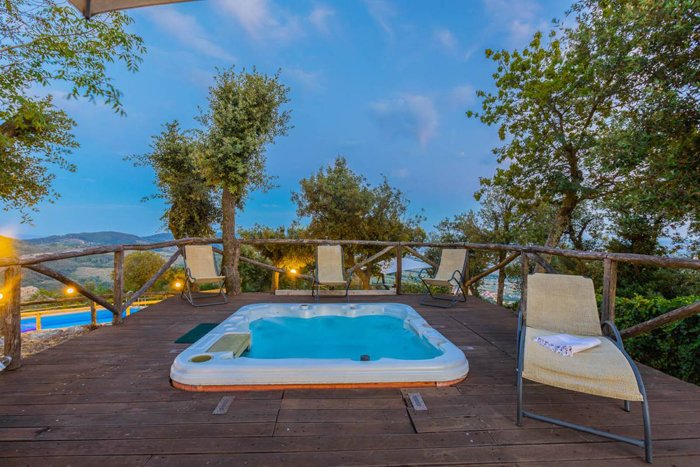 There is a large patio with several areas for dining outdoors either for breakfast or dinner. There is a large gazebo to the front and various areas in the garden for relaxing. There is an outdoor Jacuzzi for 4/5 people as well as a private pool (6x3.9m) with panoramic views. The views from the property are breathtaking and unique. There is a Michelin guide listed restaurant at 50 mts.