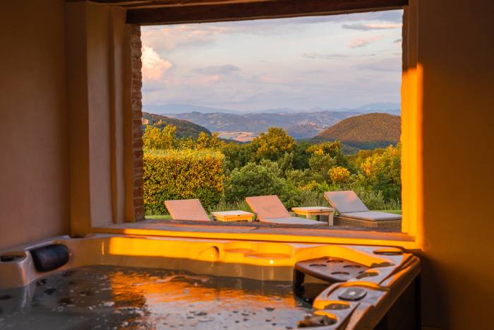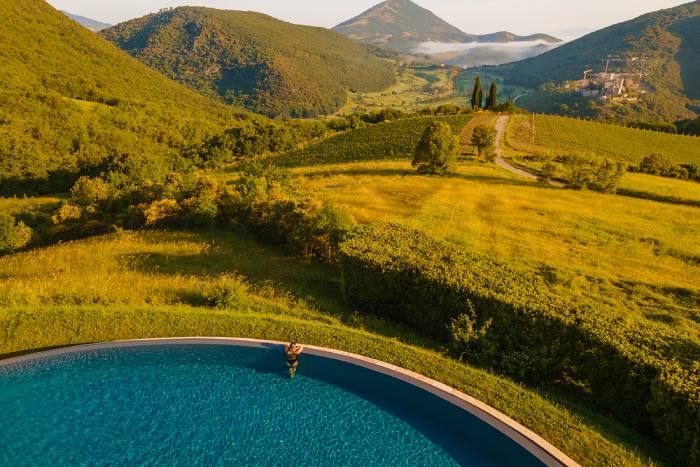 Villa Simona is a beautiful 16th century farmhouse, set on the top of one a hill, affording spectacular views across the medieval castle and its 18-hole championship golf course, which are particularly impressive from the large infinity pool, complete with Jacuzzi. The villa can accommodate up to 16 guests with the exceptional comfort and is made up of 2 units plus a pool cottage.