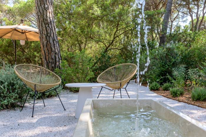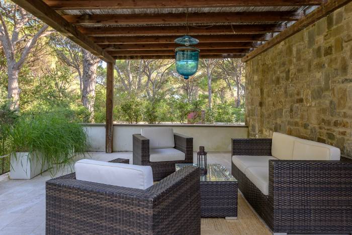 The garden is planted with herbs and aromatic plants and has a pretty water feature (fountain). There is a large, covered outdoor dining area with adjacent marble sink. To the rear of the villa off a patio, there is a staircase that leads up to a roof terrace which, is furnished in summer. There is a private path to the road that gives access to the beach, which is at approx. 100 mts.