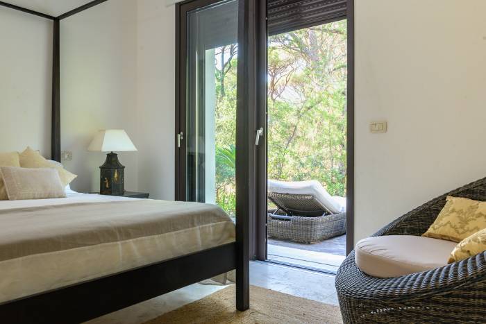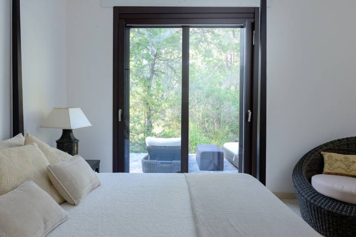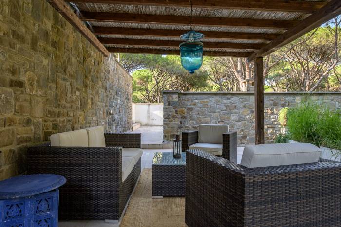 The villa interiors are light, bright and airy and the owner has included all of the mod cons you would expect with a new house. The furnishings are pale and clean-lined with modern sofas. Wooden four poster beds and marble bathrooms ensure that comfort comes as standard. The garden has been beautifully planted. Evening drinks can be taken on any one of the comfy sofas or armchairs on the terrace. The beach is a few minutes walk from the garden. On the beach there is a pergola to sit under and escape the heat of the midday sun.