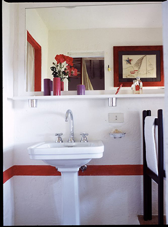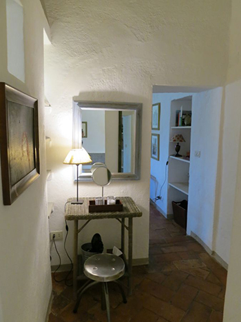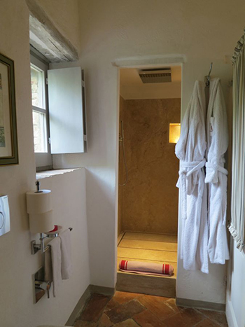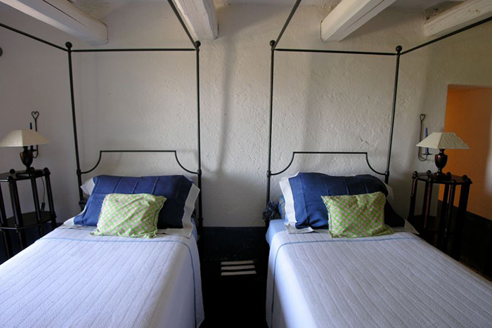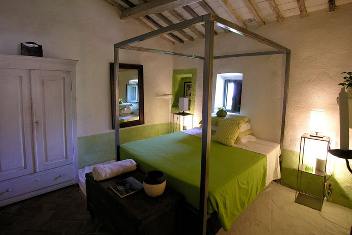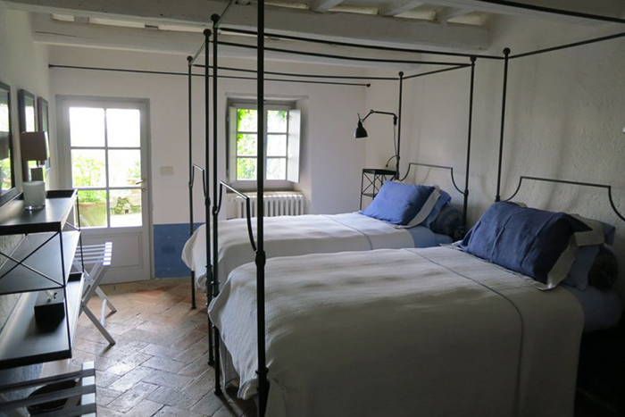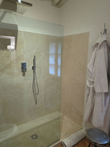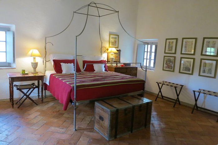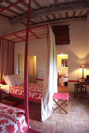 Villa Zafferano has 5 bedrooms, all with en-suite facilities. The blue bedroom, has twin beds, an en-suite bathroom, and a small terrace. The yellow bedroom is a double with a raised bed. The green bedroom is a double and has a ceiling fan. The red bedroom, is the master bedroom, it has a four poster bed, a large stone fireplace, small terrace, and en-suite bathroom. The 5th dark pink bedroom, has twin beds and an en-suite bathroom with shower.