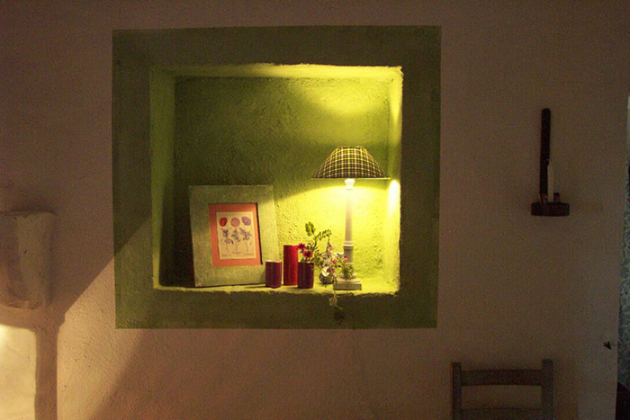 The livingroom has a large fireplace. Colourful sofas and chairs, sat TV, DVD player, hifi. There is a panoramic terrace, which has table and chairs seating 12 for outdoor dining. Next to the living room is the dining room with a large table for 10 and an exit onto the terrace. The small but well equipped kitchen has a 5 burner stove, fridge/freezer, microwave, slicer, coffee maker and a washing machine.