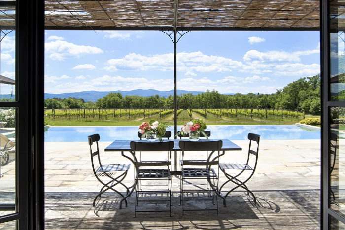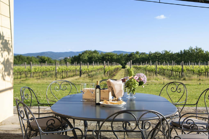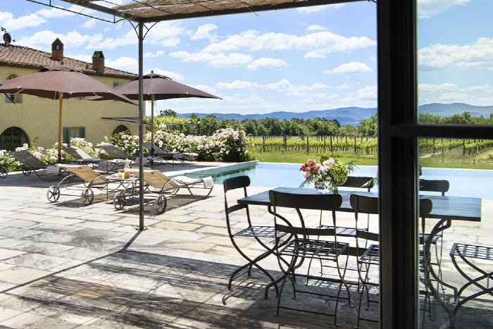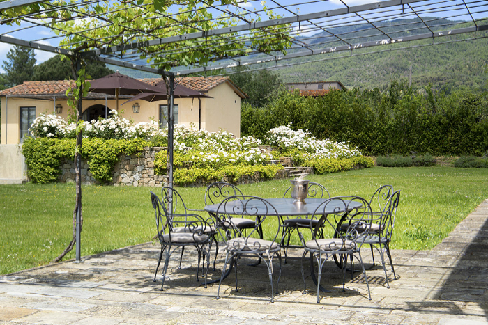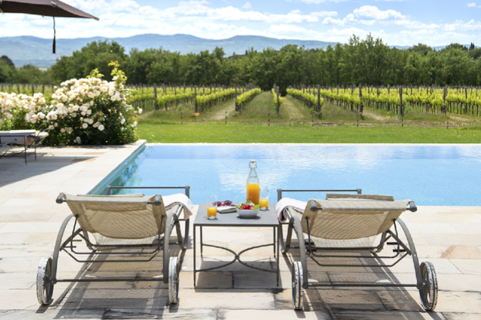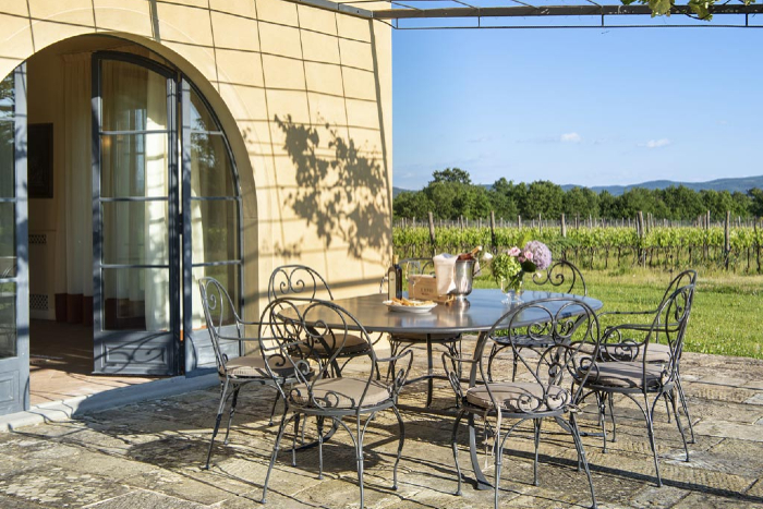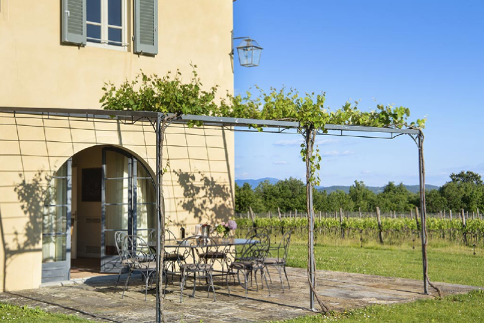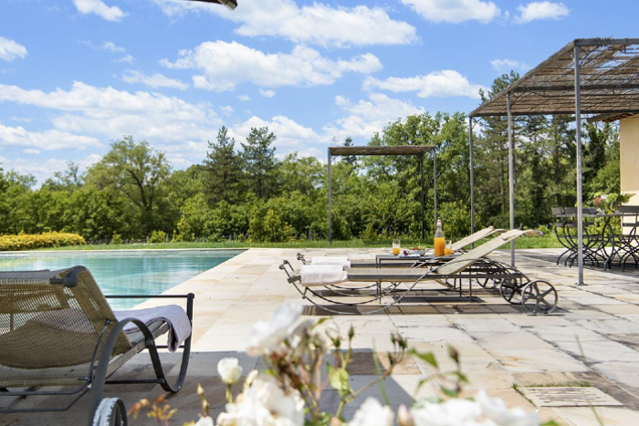 There is a large garden with a private pool at a short distance from the villa.. There is a covered pergola outside the dining room. Pool side there is a large sun terrace with loungers and umbrellas edged with roses and rosemary. The pool has an infinity edge and has views across the lawn towards the pretty vineyards that surround the villa.